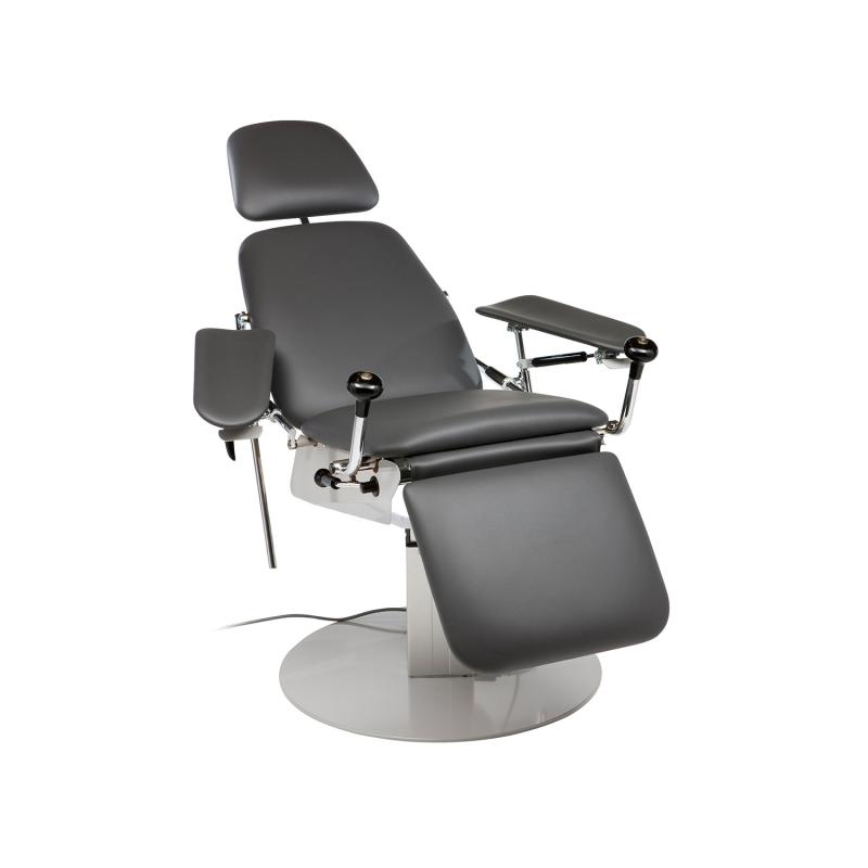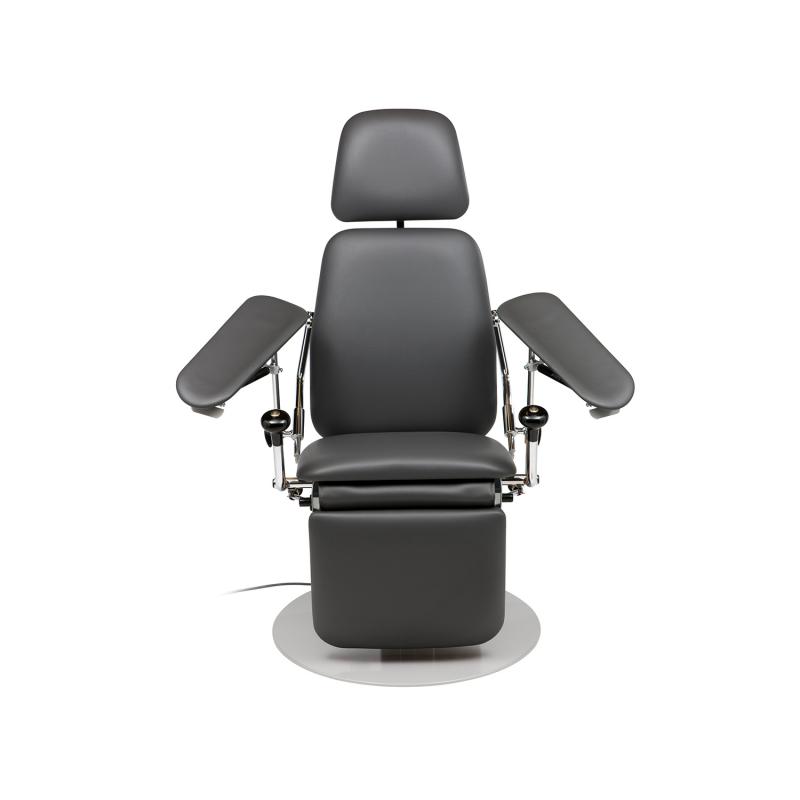The height and backrest are controlled electrically, the chair comes with an adjustable, easy to adjust headrest and the contoured armrests can be operated with one hand. The armrests and calf support move automatically when the back is adjusted, and the chair can be moved into shock position quickly and easily. The flat, round frame in combination with the column structure makes it easy to get up close to the patient without being struck by or caught on protruding chair legs.